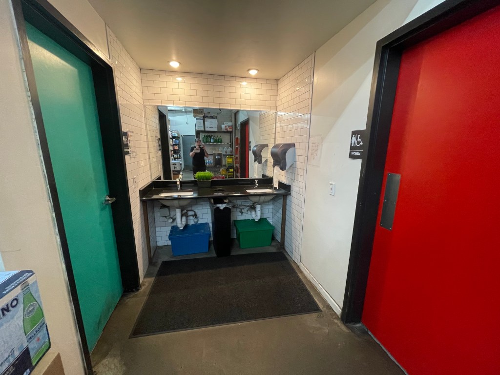 - The other bathroom is labeled as “Womens” and has two separate stalls in it, but one of them (The handicap stall) is out of order.